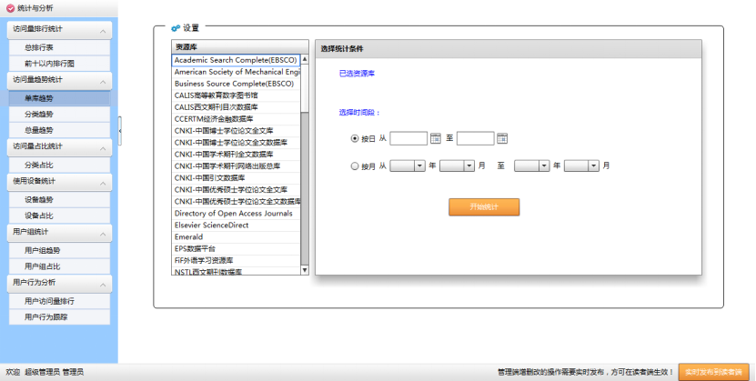 點(diǎn)擊菜單【統計與分析>>訪(fǎng)問(wèn)量趨勢統計>>單庫趨勢】,打開(kāi)單庫趨勢圖的設置頁(yè)面(如下圖)。