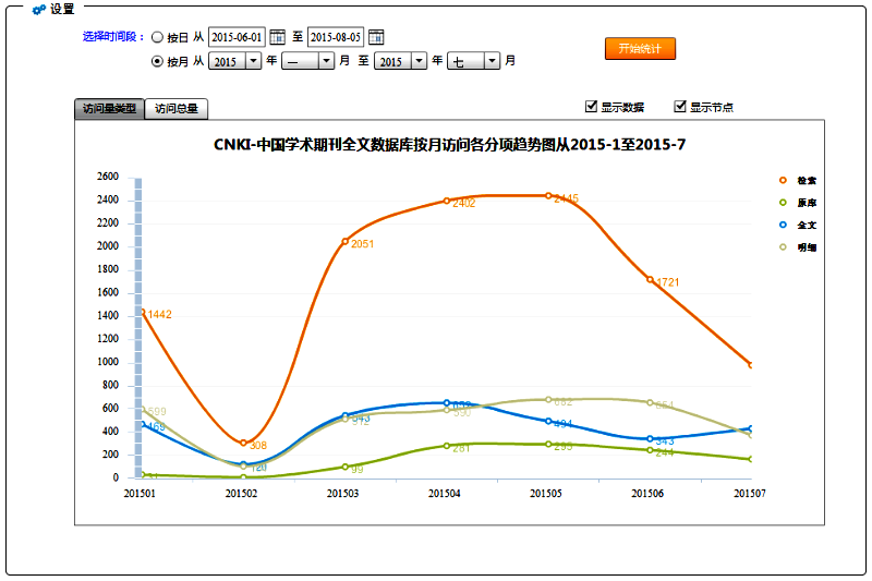例如,我們選擇CNKI-中國學(xué)術(shù)期刊全文數據庫的按月趨勢圖:按月選擇時(shí)間段為2015年1月到7月(如下圖)。