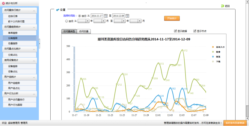 例如,選擇“期刊”分類(lèi)的趨勢圖,按日選擇時(shí)間段為2014-11-17到2014-12-09(如下圖)。